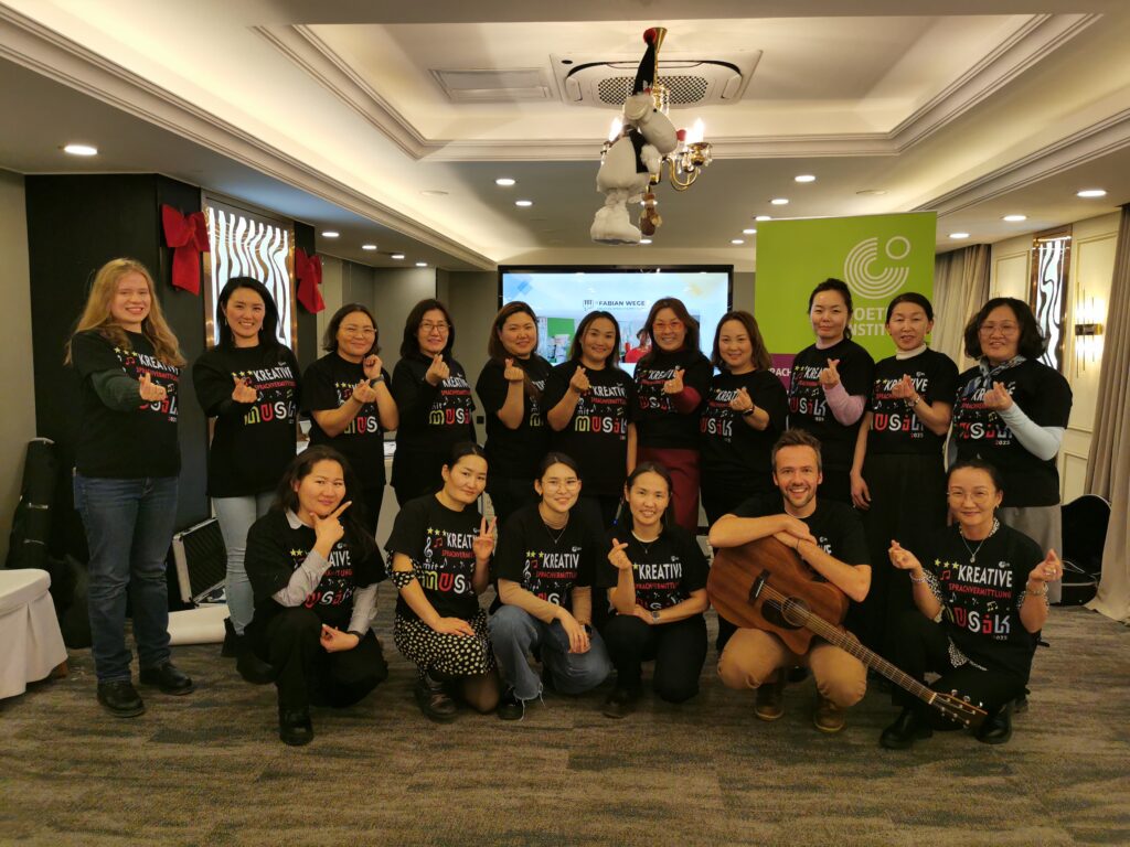 Mongolei – Ulaanbaator: im Dezember hatte ich kurzfristig die Gelegenheit für das Goetheinstitut in die Mongolei zu reisen! Im eisig kalten Ulaanbaator (bis -20 Grad Celsius) durfte ich eine 1,5 tägige Fortbildung für Goethe-Lehrkräfte, Schullehrer*innen und Hochschullehrende halten. Novum: das Goetheinstitut hat speziell für meine Fortbildung passendes Merchandise für alle Teilnehmenden herstellen lassen! Eine tolle Geste, das hat mich sehr gefreut!